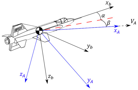 The relationship between the body frame and the aerodynamic frame with the definition of the aerodynamic incidence angles and the vectors of aerodynamic loads was presented in Figure 3. The transformation matrix from the aerodynamic frame to the body frame can be observed in Equation (6) in addition to Equations (7) and (8), which define the angle of attack and slide slip angle obtained from [46].
