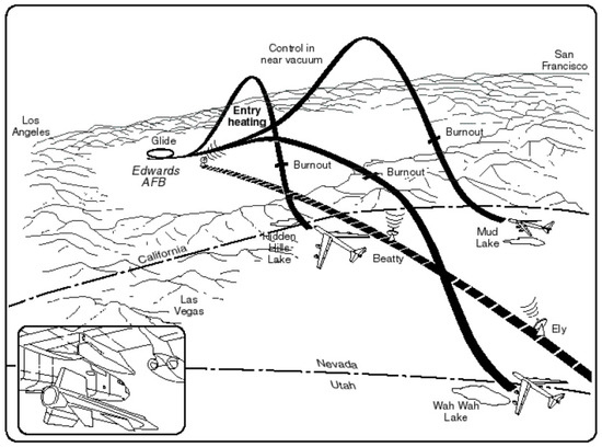 The X-15 aircraft was designed as a result of the space race during the twentieth century to overcome the tremendous challenge of designing such an experimental vehicle. The pursuit of designing a vehicle capable of reaching the edge of space to push the boundaries of human understanding into the hypersonic flow regime and fly past the 100 km of altitude led to this project by NASA. The main goal of the X-15 program was for NASA to aid in the development of materials capable of surviving the heat of reentry and the structures required for the stability and handling of the aircraft during hypersonic flight. The original mission plan of the X-15 plan involved releasing the aircraft from a carrier vehicle, which was followed by igniting the rocket motors powered by liquid propellant. The aircraft then accelerated forward and pitched upwards to increase the flight altitude, where the experimentation took place (see Figure 6). Several flights of the X-15 aircraft took place during the program’s lifetime, with one flight achieving the record for the fastest manned mission of the time by reaching a Mach number of 6.7.