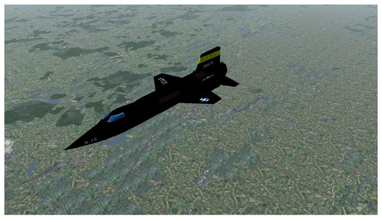 To perform the numerical simulations of the controlled flight, the rocket-powered X-15 aircraft (North American Aviation, Inc., Los Angeles, CA, USA) (Figure 1) was used as a test platform. The original X-15 aircraft was equipped with two elevators that can be deflected independently. The roll angle was controlled by the differential elevator deflections. The real X-15 initially was also equipped with two liquid-propellant Reaction Motors XLR11 (Reaction Motors Inc., Denville, NJ, USA) that could produce a total 71 kN thrust. Later, these engines were replaced by a single XLR99 motor (Reaction Motors Division of Thiokol Chemical Corporation, Denville, NJ, USA) with a 250 kN thrust.