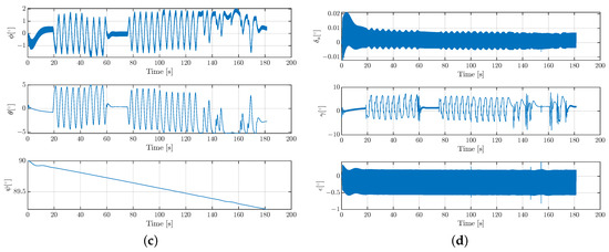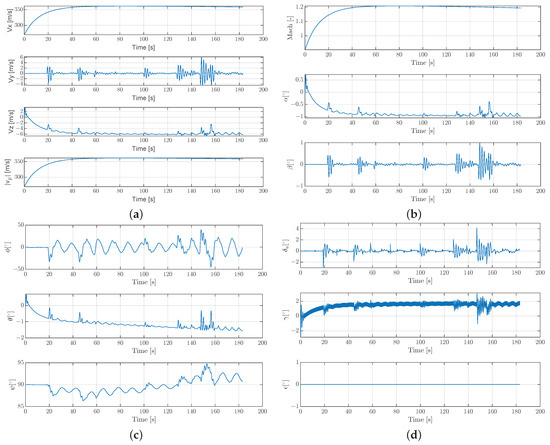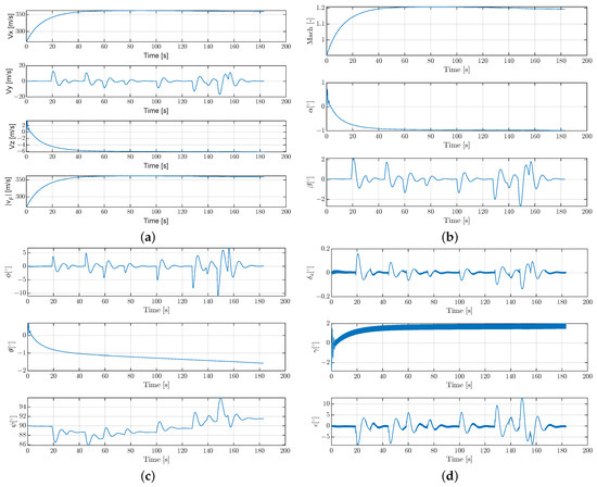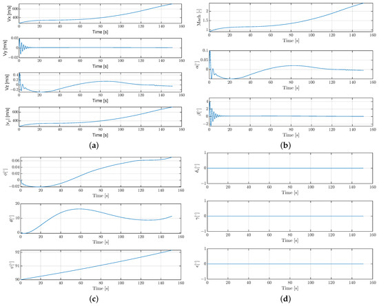 As previously mentioned, in scenario 1, the aircraft was able to perform an uncontrolled flight. The TVC system was deactivated and not used to influence the aircraft trajectory. That means the nozzle angles and were equal to 0. In Figure 9a, the components of the aircraft velocity vector and the velocity magnitude were presented. In Figure 9b, the Mach number, angle of attack, and sideslip were illustrated. Meanwhile, in Figure 9c, the aircraft Euler angles were shown. Finally, the nozzle deflection angles were presented in Figure 9d.