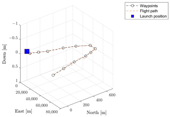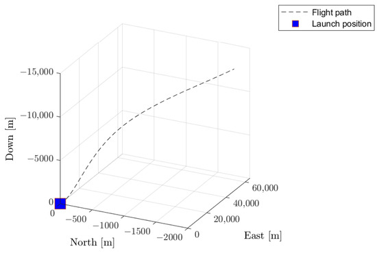 For the presented study, several assumptions were made. The model of the first version of the propulsion system was used. It was assumed that the main motor operational duration is 180 s with a maximum thrust magnitude of 71 kN. In that way, for the purposes of the presented study, it was assumed that the maximum possible speed during the controlled flight was approximately up to Mach number 2. For the analysis, it was assumed that pitch and yaw angles are influenced using only the deflectable engine nozzle. The maximum nozzle deflection angles and elevators’ deflections were set to ±15 [41]. For the original X-15, the minimum turn radius was approximately 66 km, and, based on that, the maximum allowed lateral load was 4 g. The data from [41,42] were used as input parameters for the vehicle model. Table 1 contains the necessary mass properties and reference parameters of the X-15 aircraft.