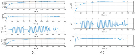 The velocity of the aircraft rose during the flight until it reached a maximum value of ≈700 , which was almost about Mach 2.5. The angle of attack and sideslip angles were approximately zero. A slight jump in the pitch angle was noticed; this can be explained by the aerodynamic characteristics of the aircraft and the effects from Coriolis forces. While both nozzle deflection angles were equal to 0 because the thrust vectoring was not used in the presented scenario.