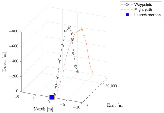 The three-dimensional trajectory is presented in Figure 10. On the vertical axis, the change in altitude (actual value–initial value) was shown.