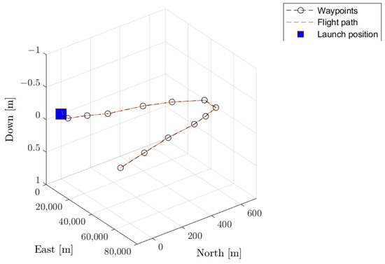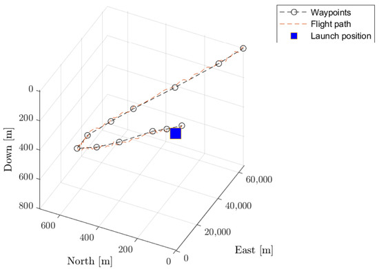 The developed model was implemented in a MATLAB/Simulink 2022a environment (see model schematics in Figure 7). The equations of motion were solved using the Runge-Kutta (RK4)-fixed step solver with step time 0.0005 s, with a total simulation time set to 180 s. To decrease the complexity of the analysis, no sensors were modelled, and the flight parameters obtained from the equations of motion were directly used in the guidance and control algorithms. The model was interfaced with FlightGear to visualise the aircraft motion (Figure 8).