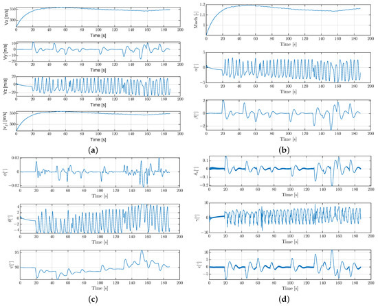 In the longitudinal aircraft response (Figure 9a, third subplot) it is possible to observe typical aircraft dynamic modes in the longitudinal motion: short period oscillations (with a period of approximately 1.98 s) and phugoid (with a period of 130 s). The same effects might be observed in changes of the angle of attack (Figure 9b, second subplot).
