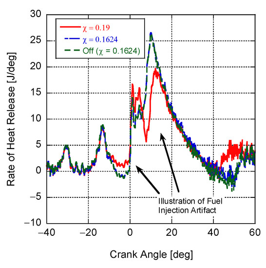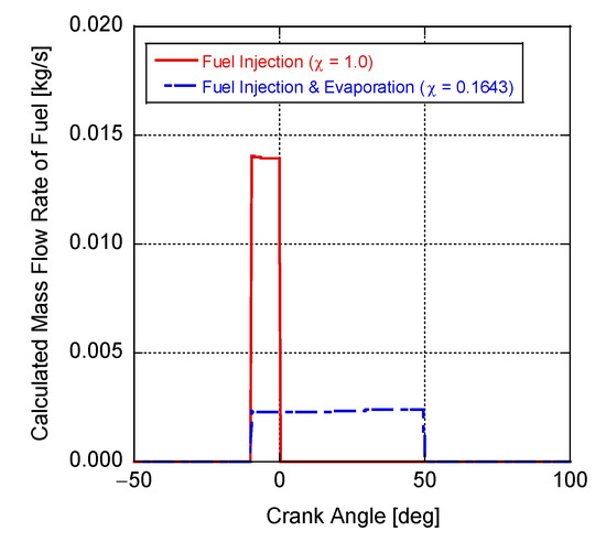where Cd is the coefficient of discharge (=0.39), An is the nozzle hole area, nh indicates each injector’s number of holes, ninj is the number of injectors, ρf is the injected fuel density, and Δp is the difference between the pressure of the cylinder and nozzle. Previously, the direct injected liquid fuel was assumed to instantaneously heat up and vaporize. However, this can lead to an injection artifact in the heat release plots that will be shown later. As the liquid fuel injected does not immediately convert into gaseous form, an adjustable parameter χ was included in Equation (7) to slow down the liquid fuel preparation process and emulate the combined injection and evaporation process. Future efforts can include an evaporation model, such as that from Li et al. [32], to better simulate this process. The model can include multiple fuel injection events as an array of dmfli/dt is used over the entire length of the simulation.