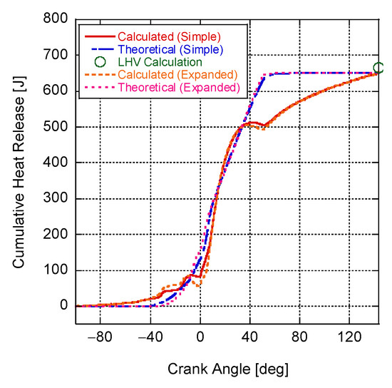 At this point, the conservation of energy equation via Equation (51) can be computed and the cumulative heat release can be found. In the prior effort, the heat transfer parameter a in Equation (56) was employed in a Newton–Raphson iteration technique and adjusted so that the total heat release equals the following:
