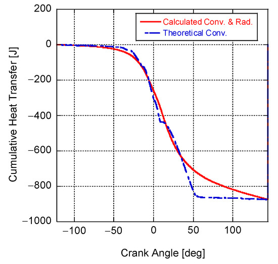The use of a relatively simple heat transfer correlation through Equation (52) to simulate the complex turbulent heat transfer process can be incorrect. Thus, while heat transfer is calibrated to match the final cumulative heat release, at each crank angle, the use of this correlation can provide an inaccurate value of heat release. If radiative heat transfer is ignored, as it is typically small for CI engines, and the theory is utilized to solve for the heat release, the conservation of energy equation can be used to solve for the convective heat transfer: