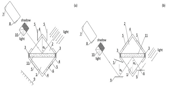 The structural diagram of the optical refractometer part and ray propagation in the upper (a) and lower (b) prism: 1 is lower triangular prism (leucosapphire material), 2 is upper triangular prism (leucosapphire material), 3 is silicone gaskets, 4 is swivel mount of prisms, 5 is closing shutter, 6 is mirror, 7 is eyepiece, 8 is lens on movable mount, 9 is mirror, 10 is plate for registration of the light-shadow boundary, and 11 is research mixture.