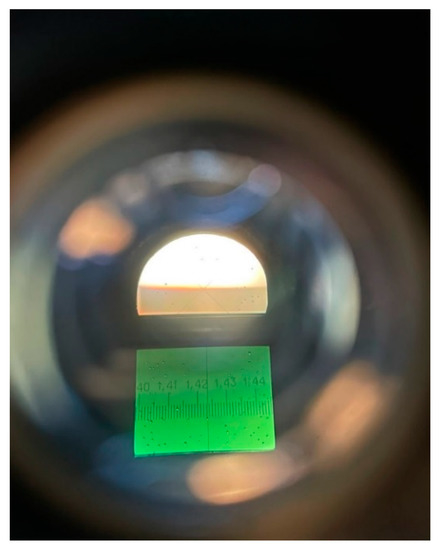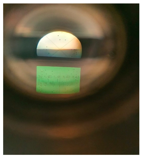 The light-shadow boundary and the refractometer scale measuring a mixture of two gasolines (AI-92 and AI-80) using the upper prism 1 (Figure 1). Gasolines of AI-92 and AI-80 brands are mixed in a proportion of 0.7 to 0.3.