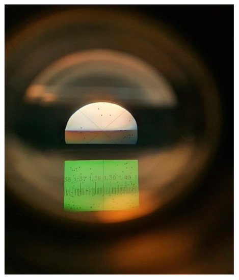 The position of the light-shadow boundary is related to the rotation angle of plate 10 with respect to the angle αh. In the case of placing the border light-shadow in the crosshairs of the plate 10, the rotation angle of the plate 10 becomes equal to αh. The value of nm is determined from Equation (6). The calibration of the refractometer scale is made in accordance with the Equation (6). The measurement accuracy nm is determined by the mechanics of adjusting the position of the plate 10; also, by providing the conditions for the incidence of part of the light rays used for measurements on the front faces of the prism 1 and 2 at an angle of 90 degrees. To do this, the user can adjust the position of the mirror 6 by changing the angle of the cover 5 with respect to the direction of the incident light.