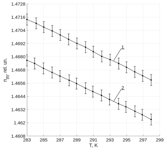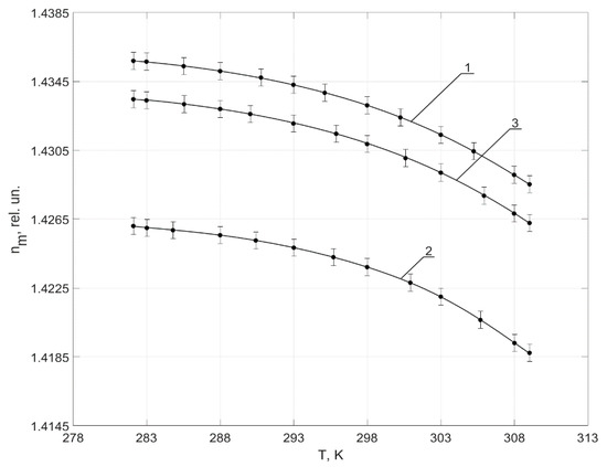 The obtained results coincide in the dependence change structure of nm from T with the investigations results carried out by other scientists [65,66,67,68,70,71,72,73,74,82,83,84,85,86,87,88,89]. This once again confirms the great functionality of the refractometer developed by us.