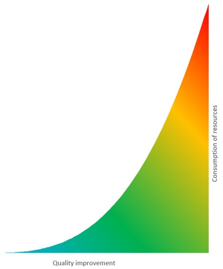 Figure 1. Consumption of resources for quality improvement (the authors’ own study). - Weakest parts of the IQ model can be found. It makes it possible to use IQM to improve the IQ of the whole system by improving the IQ of the weakest elements. This function of IQM can improve the system’s IQ at the lowest cost [,].