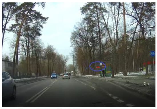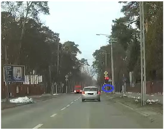 In order to demonstrate the method’s effectiveness, the project authors selected an intersection traffic light system as an example. At this intersection, the no-entry rule is frequently violated when the red light is lit. A photographic view from a driver’s position is shown in Figure 6. Figure 7 presents a photograph with the probable element that disturbs the correct interpretation of the intersection’s lighting system state. Pictures have been taken from the car travel registration because we would like to show how this scene looks from the driver’s position. It is a red-coloured glowing roadside advertisement. The blue oval indicates this red roadside advertisement in both pictures in Figure 6 and Figure 7. The model describing the object will consist of two last information states, forwarding and interpretation. Information transfer redundancy (double traffic lights at the intersection) was conducted in this case. Two cases were considered: