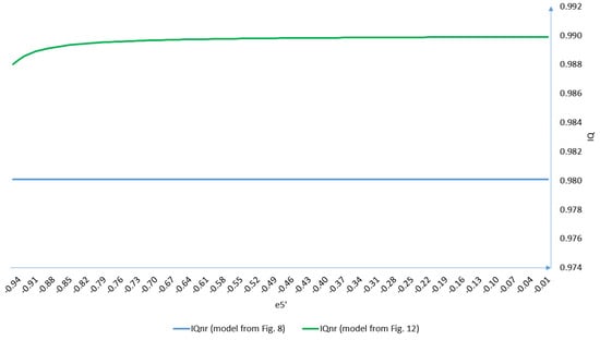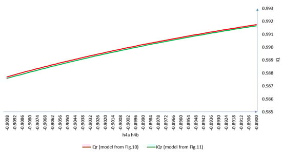 Figure 13 shows differences in the impact of observation of IQr coefficient values for the models from Figure 10 and Figure 11. The h4a = h4b coefficient ranges from −0.91 to −0.89. The value range was selected based on the values in Table 2. In this range, we would expect a proper IQ variability in relation to observations h4a and h4b for authenticating the proposed method. We created these simulations based on research published in our previous articles [,,,,,].