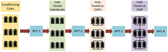 The cells in 1S3Ps were disconnected and RPT-3 was performed. Later, the cells were connected to form the 3S3P module, as seen in Figure 4. Rows 1, 2, and 3 represent each of the 1S3Ps within the 3S3P system, respectively. The 3S3P module was placed in an ESPEC chamber and was wired to a Chroma 17020 module cycler. The currents of Cell 3, Cell 6, and Cell 9 were computed based on KCL, considering the current recorded by the Chroma cycler for the module.