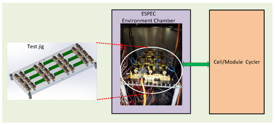 LP is known to be highly influenced by ambient operating temperature [8], and hence, it is important to validate the tests at different temperatures. The temperatures considered for the study are 25, 10, 5, and 0 °C inside an ESPEC environmental chamber. The charging rates (Crates) used were 0.3, 0.5, and 1C. The electrochemical performance of the cells was benchmarked with a reference test (defined in Section 2.2) at the beginning, over the course of the experiment, and at the end. The overall experimental process is depicted in Figure 1 and the experimental platform in Figure 2. The setup and VRP evaluation of cells in various scenarios are presented below.