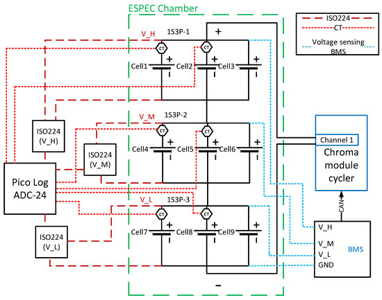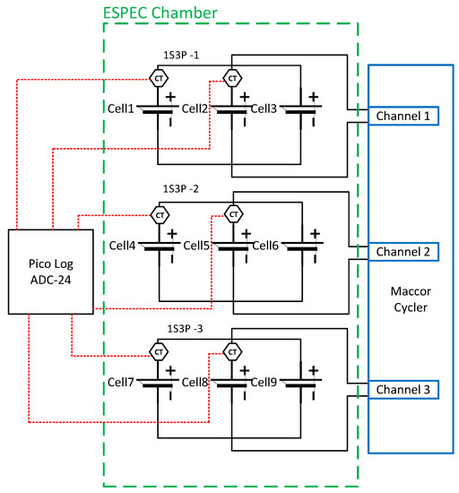 Two Tektronix TCP312A current probes (CT) were used with TCPA300 amplifiers for each 1S3P; the output of these were interfaced to a Pico Log ADC-24 data acquisition system interfaced to a laptop for data recording at a rate of 1Hz. The sensors are capable of accurately measuring currents with a sensitivity of ±1 mA. The circuit and connections of the 1S3P modules are shown in Figure 3. The currents of Cell 3, Cell 6, and Cell 9 were computed based on Kirchhoff’s current law (KCL), considering the current recorded by the Maccor cycler for respective modules.