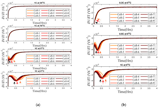 It can be seen in Figure 5a, for 25 and 10 °C, the Li stripping characteristics are not observed in the OCV, even for a higher Crate of 1C. This is due to improved charge kinetics and diffusion at high temperatures. The two-stage decay in OCV is predominantly seen in the VRP at lower temperatures. All the cells were maintained at the same temperature, and the maximum deviation from the setpoint value was ±0.5 °C. However, cell-to-cell variations were prominent in the result obtained. Cells 1 to 3 exhibited higher, cells 4 to 6 had moderate, and cells 7 to 9 had minimum levels of stripping.