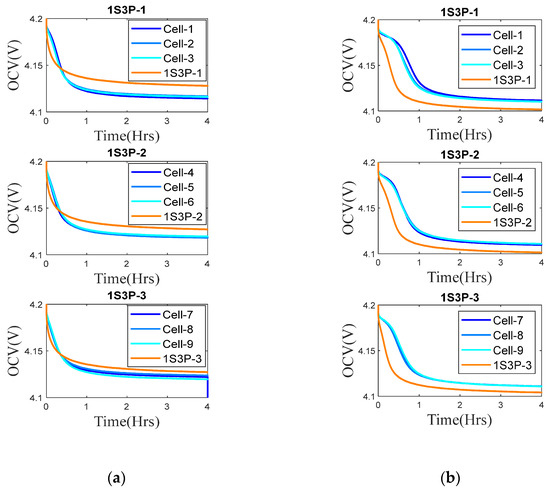 OCV of cells charged at 1C, individually and in 1S3Ps: (a) At 5 °C. (b) At 0 °C.