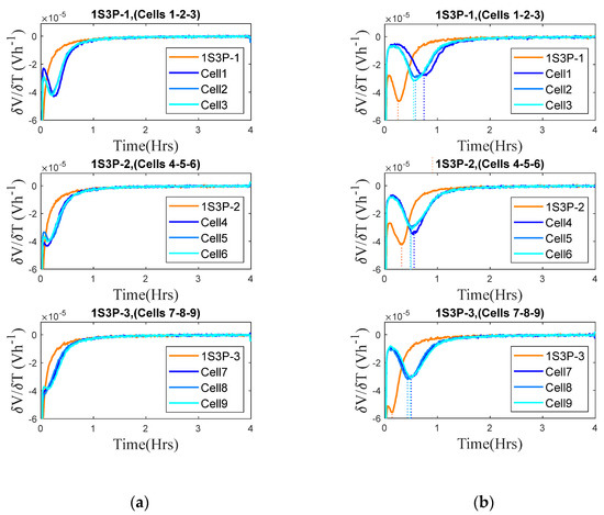 An ambient temperature of 0 °C stimulated more Li stripping associated with reversible LP for the cells considered, even for lower currents of 0.3C. The influence of Crate on Li stripping at 0 °C is revealed in Figure 5b. From these results, it could be seen that the VRP is only effective in detecting the possible onset of LP for temperatures of 5 °C and below when cells are charged at 0.5 and 1C. Hence, it is possible that the VRP may only be effective for similar scenarios when these cells are connected in series-parallel combination. This is evaluated in the following sections.