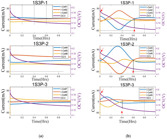 The steady current flow during rest seems to affect the Li stripping process, and hence, the voltage plateau is negligible at 5 °C and not captured in the VRP. However, as seen during individual cell tests, stripping is prevalent at 0 °C and this explains the plateau in Figure 8b. Stripping is initiated within each cell in 1S3Ps, there will be variations in the plateaus of the individual cells, as observed in Figure 5a in Section 3.1. Nevertheless, since cells are connected in parallel, they cannot have different voltages and this leads to counteracting current flow within each 1S3P branch. Once stripping is completed, the dynamics in current flow settles down and steady balancing current flow continues to exist till the end of 4 h rest.