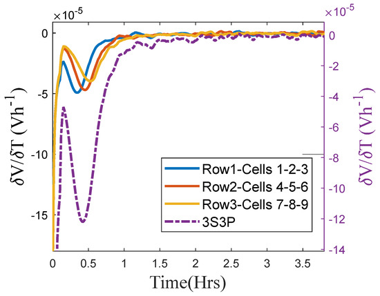 The results from 3S3P testing showed Li stripping only for 0 °C with 1C charging, as noticed in 1S3P testing (Section 3.2). The VRPs of the 3S3P module and 1S3Ps within the module are depicted in Figure 9. Rows 1, 2, and 3 represent 1S3P-1, 2, and 3, respectively.