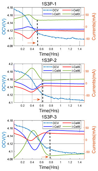 The charge and discharge protocols programmed in the Maccor were modified to suit the 1S3P configuration of cells. The charge–discharge currents and CV cut-off limits were scaled up by a factor of three to suit 1S3P cycling. The test scenarios of individual cell tests were repeated on all the 1S3P modules and the VRP was computed from the rest period OCV. In addition, the inter-cell current flow during cycling and relaxation was monitored.