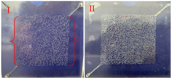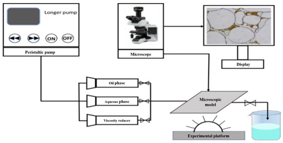 - The experimental equipment was connected according to Figure 2. The microscopic glass pore model was vacuumed first, and formation water was injected to make it full of the model; 0.729~1.215 mL formation water was injected into the models. The injection rate was 0.1 mL/min.