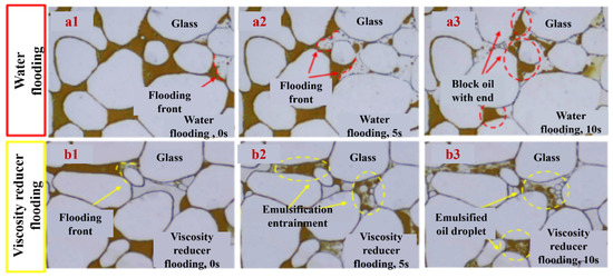 It can be seen from Figure 15 that the displacement effect at the inlet end and the middle area was high, and there still was a lot of residual oil at the outlet end and the edge of the model after water flooding. The types of residual oil are mainly oil drop residual oil, blind-end residual oil, and cluster residual oil. There was no obvious residual oil distribution at the inlet, middle, and outlet of the model after viscosity-reducer flooding, and there still was a small amount of residual oil in the edge area, which was mainly at the blind end. The results of experiments show that viscosity-reducer solution can significantly increase the sweep area compared with water.