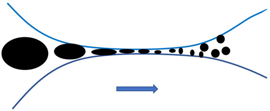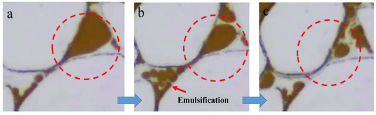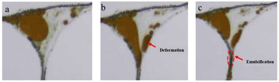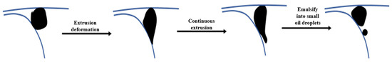 Figure 8 displays channel-extrusion emulsification. Figure 8 shows the process of channel-extrusion emulsification. As shown in Figure 8 and Figure 9, when oil drops flowed through small channels, large oil drops were emulsified into the small oil drops. This process was the result of the joint effects of channel extrusion and viscosity reducer’s amphiphilic properties. First, when oil drops entered small channels, a large degree of deformation occurred. A deformation was the main factor for the large oil dropping to be emulsified. At the same time, due to the amphiphilic nature of viscosity-reducer solution, the oil–water interfacial tension was reduced, which made the oil droplets more easily emulsified into small oil droplets.
