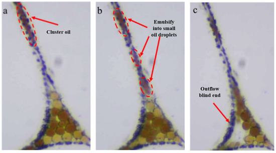 Figure 6 displays blind-end emulsification. Figure 7 shows the process of blind-end emulsification. As shown in Figure 6 and Figure 7, the emulsification of the blind-end oil is mainly attributed to the viscoelastic properties of the viscosity-reducer solution. When the viscosity-reducer solution flowed through the blind end and contacted the oil drops, both the viscosity-reducer solution and the oil drops had a certain degree of deformation. However, because the heavy oil does not have the viscoelastic property, its deformation amplitude was less than that of the viscosity-reducer fluid and the heavy oil drops became small oil drops and then flowed out of the blind end under the constant extrusion of the viscosity-reducer fluid.