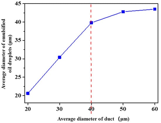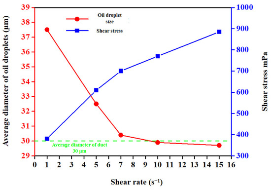 In this experiment, the permeability was 0.07D, and the porosity was 0.15. Figure 10 shows the relationship between average particle size and shear stress of emulsified oil droplets with a shear rate. As shown in Figure 10, the shear stress increased with the expansion of the shear rate, and the oil droplet size in the model decreased with the increase of the shear. When the shear rate in the model was greater than 7 s−1, the emulsified oil droplets between model pores were smaller than the average diameter of the pore channel (30 μm). The pore throat emulsion was formed, which was conducive to enhancing heavy oil recovery. Considering all factors comprehensively, in the following research, the effect of pore throat channel size on the dispersing emulsification of heavy oil in the model was investigated at the shear rate of 7 s−1.