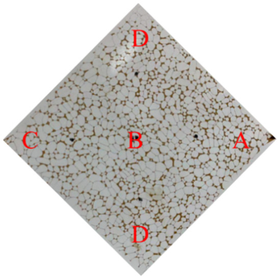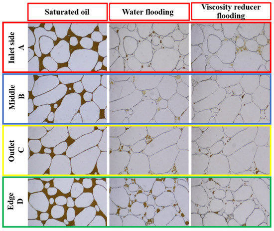 In the actual flooding process, the heavy oil recovery in different areas of the microscopic model is different. Therefore, in order to analyze the effect of viscosity reducer as comprehensively as possible, the model was divided into four parts, according to the flow direction of the flooding phase for analysis: A—inlet end, B—middle of the model, C—outlet end, and D—edge area, as shown in Figure 14.