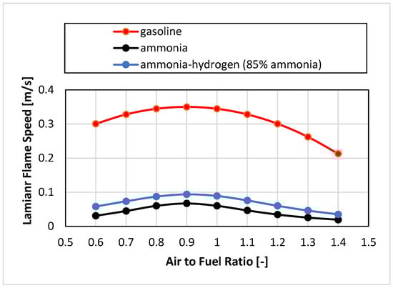 Laminar flame speed comparison in ambient condition. Data were calculated according to Equations (1)–(5) for ammonia and hydrogen–ammonia blend, according to [34] for gasoline.