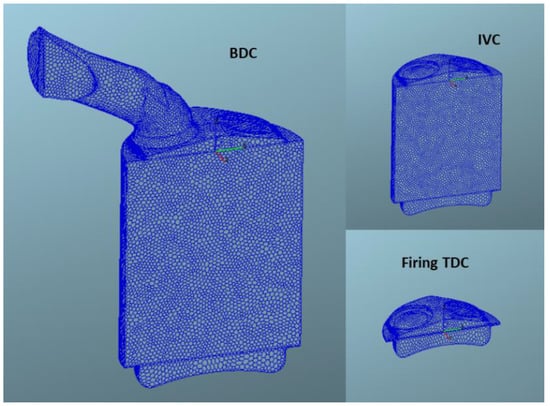 A 3D computational model, previously built by means of the commercial code AVL Fire, was used to reproduce some 1D results. Briefly, a first-order (Euler) implicit differencing scheme was used for time discretization, while second-order schemes were used for both continuity and momentum equations. An upwind scheme was used for both turbulence and energy equations. Turbulent effects were modeled using the well-known k-ε approach. This model was widely used in the past to reproduce the behavior of the same engine running with gasoline, obtaining very reliable results [32]. It was adapted to the ammonia–hydrogen engine operation referring to the Nakamura mechanism previously described. Thus, different chemical species were considered during the simulations, and the fuel oxidation process was simulated by means of a chemical–kinetic approach. The engine mesh, reported in Figure 3, reproduces only half geometry due to the symmetry of the engine geometry. The minimum number of the grid cells is about 50,000 (firing TDC), while the maximum number is approximately 350,000 (BDC during the intake stroke). Boundary and initial conditions were set by utilizing the computations provided by the 1D model previously depicted. In the inlet runner, a premixed air–fuel mixture was considered.