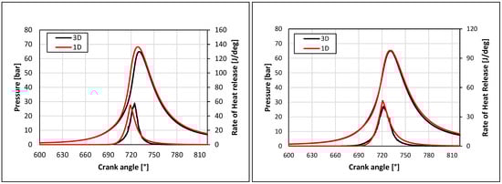 Figure 4 shows both in-cylinder pressure and heat release curves for each investigated case. The best agreement between the models was reached at 3000 rpm with a difference in pressure peak of about 0.47%, while at 1500 rpm, the difference was of about 4.9%. The agreement between the two models seemed to be good. These results confirm that the 1D model effectively predicted the behavior of the analyzed engine. Thus, it was implemented for the following analyses involving the fuel blend under study.