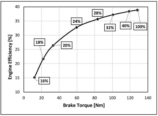 As an example, Figure 5 shows the engine efficiency calculated at 3000 rpm when the load changes. Of course, due to the increasing pumping losses, when reducing the engine load by throttling, the efficiency decreased.