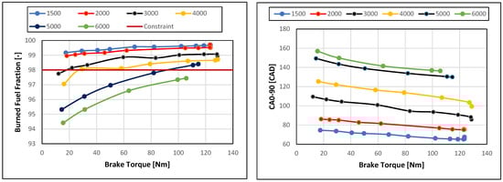 Furthermore, the typical increase in the angular combustion duration (CA 0–90) for increasing engine speeds (Figure 6, right) became critical for the lowest loads at medium regimes and for almost all the loads at high regimes. In fact, in the latter cases, the minimum allowable burned fuel fraction (98%) was not reached (Figure 6, left). As a consequence, the operating range of the engine significantly reduced. Partial load conditions were sustainable for the whole considered range at 1500 and 2000 rpm, with a burned fuel fraction at minimum load, respectively, equal to 98.8% and 98.9%. At 3000 and 4000 rpm, the entire map was not exploitable since the lowest loads did not respect the imposed constraint. At 5000 rpm, only WOT and very low throttling conditions guaranteed a proper engine operation, while at 6000 rpm, the 98% burned fuel fraction was not reachable. It is worth underlining that, in this partial load analysis, all the other constraints were respected; therefore, they are not reported.