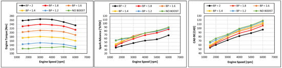 In this subsection, the behavior of the engine at WOT was evaluated considering different engine speeds, from 1500 to 6000, and different boost pressure (BP) levels, up to 2 bar. Stoichiometric mixtures were always considered.