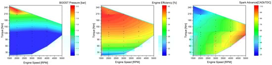 Boost level, engine efficiency, and spark advance as a function of engine speed and torque.