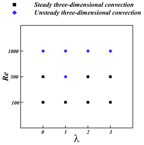 Figure 3 presents the bifurcation map. The thermal field was categorized into two regimes according to the wavelength and Reynolds number: steady three-dimensional convection (S3C) and unsteady three-dimensional convection (U3C). For Re = 100, the structures reached the S3C regime in all the cases because the natural convection effect was dominant at Re = 100, which resulted in convective flow in the z-direction. For Re = 500, the thermal field reached two different regimes. The thermal structure reached the S3C and U3C regimes. At λ = 0, 2, and 3, the flow regimes reached the S3C regime, whereas the flow regime reached the U3C regime at λ = 1. This is because the mutual interaction intensified in the space between the enclosure and the saddle at λ = 1. When λ was increased to 2, the mutual interaction was dispersed as the saddle increased. As a result, the thermal structure reached the U3C regime at λ = 1. For Re = 1000, the regimes reached U3C in all cases because as Re increased, the convective flow by the forced convection was strengthened, and the instability increased.