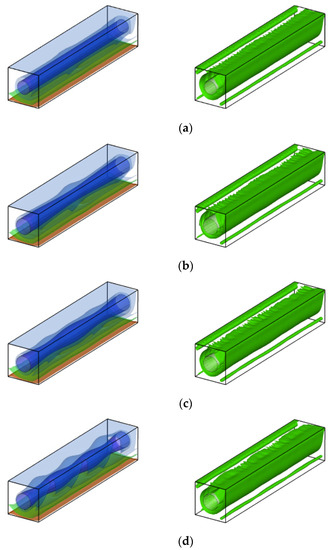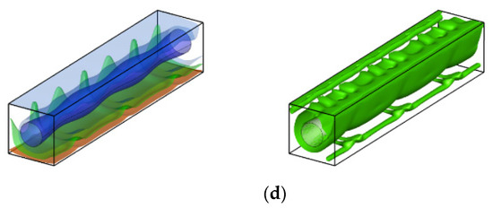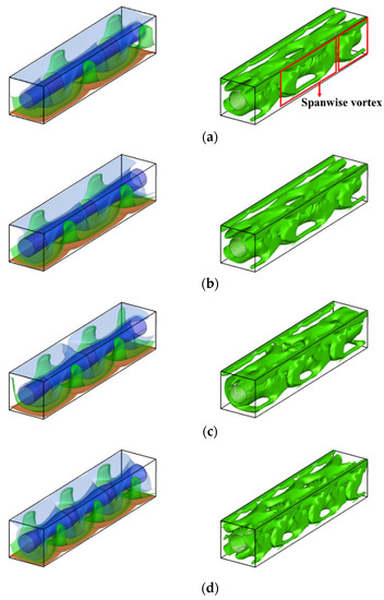 Figure 5 in the right column presents the vortical structures obtained at Re = 500. For λ = 0 and 1, the spanwise vortices at Re = 100 disappeared on the cavity, as shown in Figure 5a,b. This is because the effect of the forced convection increased compared to the case for Re = 100. For λ = 2, the counter-clockwise vortices and the streamwise vortices were observed near the bottom wall. The shapes of the vortex near the top wall became complex compared to λ = 1 because the variation in the upper space between the node and the saddle destabilized the convective flow caused by the moving top wall. As a result, the unstable kinetic energy of this convective flow was transferred to the velocity in the z-direction, resulting in the complex shape of the vortices near the top wall. As the period between the saddle and node decreased, kinetic energy transfer was restricted by small variations in the lower space between the node and the saddle. Hence, more streamwise vortices were formed near the bottom wall at λ = 3.