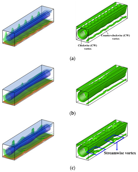 Figure 6 in the left column presents the distribution of temperature obtained at Re = 1000. The ascending plumes at Re = 500 disappeared due to the dominant effect of forced convection. The right column of Figure 5 presents the vortical structures obtained at Re = 1000. When Re was increased to 1000, the angular momentum of clockwise convective flow was intensified by the dominant effect of the forced convection. Thus, the streamwise vortices observed at Re = 500 disappeared near the bottom wall, and the shape of the vortices became simpler than at Re = 500. This is because the spanwise and streamwise vortices were restricted by the high kinetic energy in the clockwise convective flow.