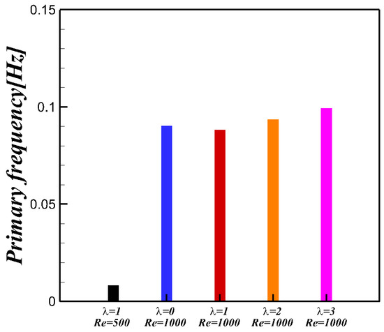 Figure 8 presents the primary frequency distribution of <NuB> for different values of λ. The cases for Re = 100 were the S3C regime, and the primary frequency was zero. When λ = 1 at Re = 500, the saddle caused the instability of flow because of the restricted occurrence of the ascending and descending plumes at the saddle. As a result, the flow regime reached the U3C regime, resulting in a dominant frequency of approximately 0.0083. When Re was increased to 1000, the flow regime reached an unsteady state regardless of λ. Furthermore, the primary frequency of Re = 1000 became larger than Re = 500 because, for Re = 1000, the angular momentum of the clockwise convective flow was intensified compared to Re = 500. This intensified momentum increased the instability of flow. In addition, the primary frequency of <NuB> increased when λ was increased from 1 to 3. This is because the strength of the clockwise convective flow decreased due to the increased flow passage at the space between the enclosure and the saddle.