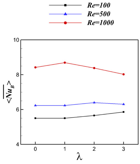 For Re = 500, was almost the same when λ was increased from 0 to 1. When λ was increased from 1 to 3, increased then decreased. This is because the streamwise vortex was formed on the lower part of the cavity at λ = 2, and the streamwise convective flow was distributed more by the increased number of the saddle at λ = 3. As a result, the largest value of was observed at λ = 2, and increased by 2.6% compared to the minimum value of .
