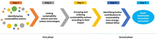 In step 3, the sustainability actions are ordered according to (a) the technologies involved and (b) their matureness and relevance in the company’s overall strategy. To do so, they are first assigned to technology groups (i.e., groups of sustainability actions involving the same or similar technologies), based on the identified common linkages to specific technologies in the ETP-CET Guide. These technology-related groups are then grouped into larger “macro-groups” according to their TRL scores and their role and relevance in the business strategy of the company.