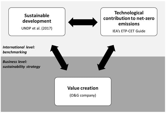 The proposed triangulation approach to analyzing the company’s strategy, from a triple business–sustainability–technology perspective, facilitates obtaining a fuller picture of the complex environment surrounding the company (Figure 2). The use of triangulation methods is justified as the case of an O&G company developing a sustainability strategy in the context of energy transition is sufficiently fairly complex along several dimensions [27,28,29]. This way, the company’s value creation goal (“business level” in Figure 2) can be analyzed through the lens of two relevant and independent references (“international level” in Figure 2) which focus on the need to achieve sustainable development and global net-zero emissions simultaneously, thus working as a double sustainability benchmark. In particular, adding the technological dimension through the IEA ETP-CET Guide provides insights about the extent to which the innovation capacities of the O&G companies are aligned with the types of research and development (R&D) and innovation required for achieving net-zero emissions in the energy sector.