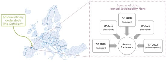 The case study is based on the analysis of a company that owns and operates a refinery in the Basque Country region in Northern Spain (henceforth, referred to as “the Company”). The chosen case complies with the basic scientific requirements of case study methods [35,36,37], as the Company’s situation can be considered to be of transparently observable interest and has enough importance and significance at the local level to be critical within the reality of the Basque Country. Further, the analysis of the Company’s case under the lens of a standardized methodology may offer valuable insights for replicating the analysis for comparable companies.