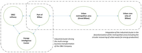 Both collaboration initiatives share, as a flagship initiative, the Basque Hydrogen Corridor (BH2C), also led by the Company. This is a public–private initiative supported by approximately 80 entities at the regional level (companies, R&D centers, universities and public institutions) with the aim of developing a complete, competitive hydrogen value chain in the Basque Country. The germ of such a long-term regional innovation and industrial development initiative can be found in some of the Company’s key technological projects (see Table 1 and Table 2). These projects are located in the geographical vicinity of the Company’s refinery with a strong local approach, closely linked to the surrounding industry in the metropolitan area, to the nearby industrial port and to sources of urban waste resources, appearing to be setting the pillar of a new industrial decarbonization hub (Figure 5).